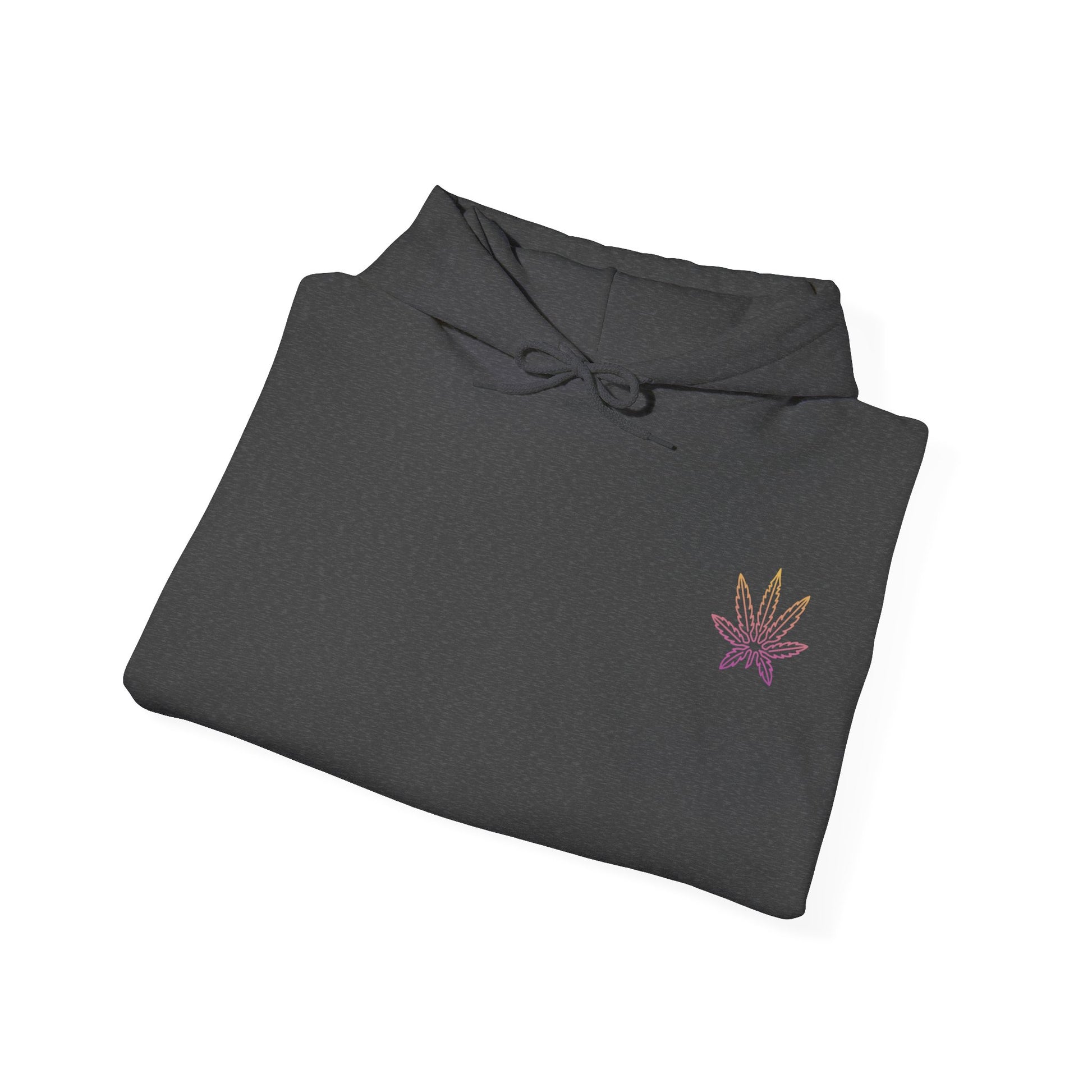 Front left-chest print: Multicoloured weed leaf — vibrant, eye-catching, and elevated